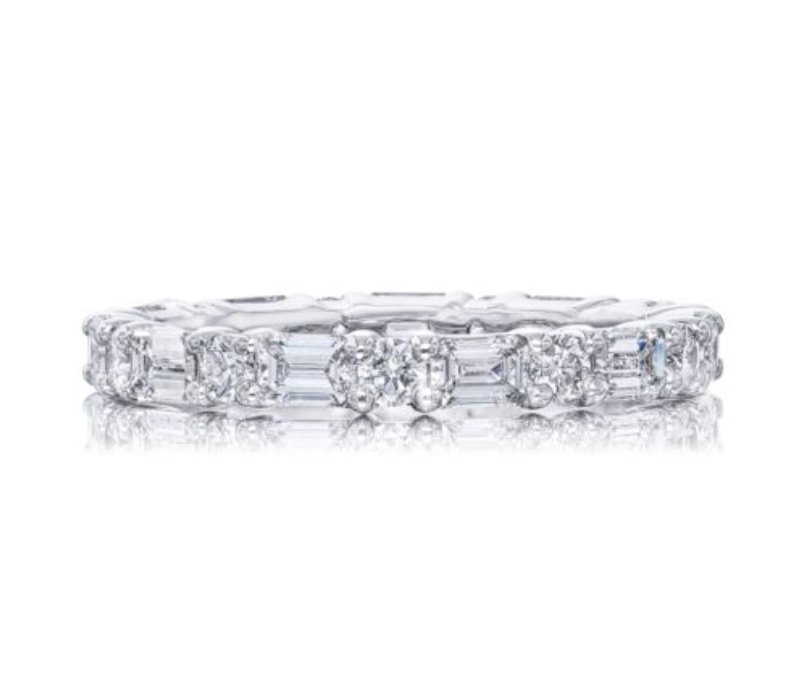 Gorgeous diamond eternity band featuring emerald-cut and round diamonds in an alternating design. Handcrafted in pure platinum.