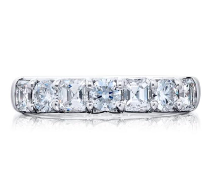 Elegance Elevated: Our classic Diamond Band. These beautiful square emerald-cut diamonds blend with round-cut diamonds and are meticulously handcrafted in pure platinum.